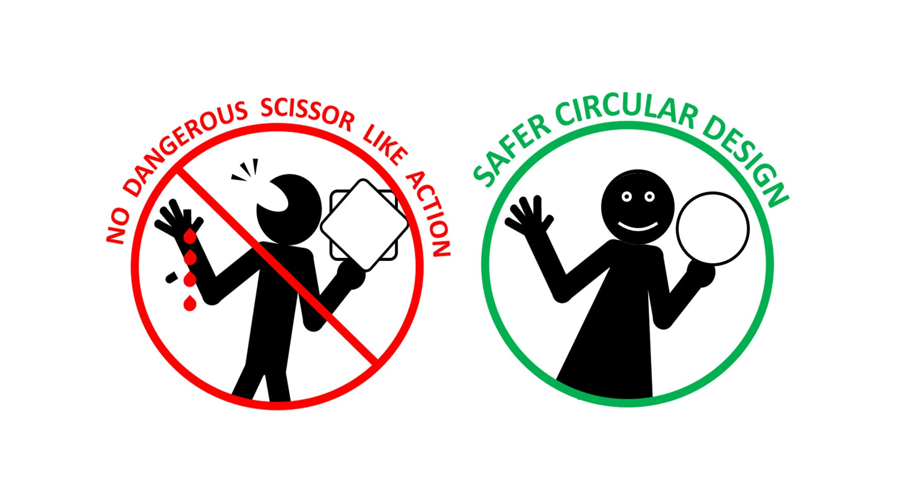 Round. About 5.5-inch (140 mm) diameter design for safety. No scissor-action.